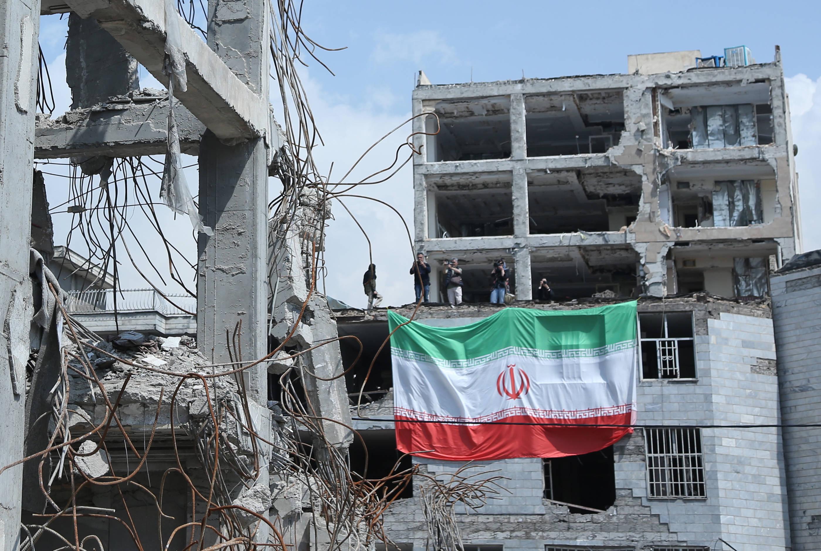 4月20日,在伊朗首都德黑兰,伊朗国旗悬挂在遭美以空袭严重损毁的居民区建筑物上。新华社记者沙达提摄“悄悄”发声明