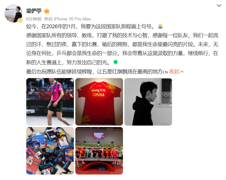 作为奥运冠军孙颖莎的师弟,梁俨苧曾承载着许多人的期望,他所在的河北队培养出了多位世界级选手,这种环境既给了他机会,也带来了压力,在他的告别宣言中,没有怨言,只有感恩:“感谢国家队所有的领导、教练,打磨了我的技术与心智,感谢每一位队友,我们一起流过的汗、熬过的夜、赢下的比赛、输后的拥抱,都是我生命里最闪亮的片段。”